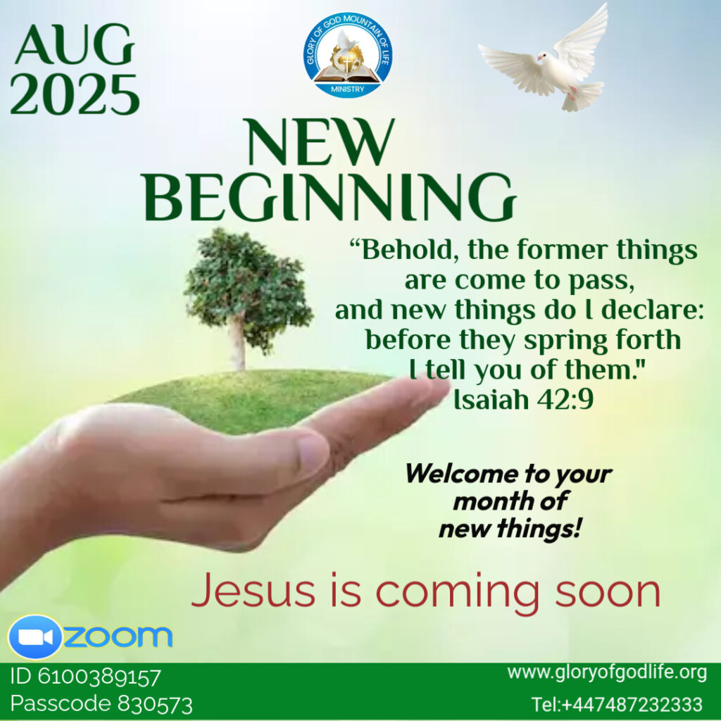 5. He gives you a new thanksgiving. New beginning, whether desired or unexpected offers an opportunity to be grateful to God. Every morning is a new chance to show our gratefulness toward the Lord “Enter into his gates with thanksgiving, and into his courts with praise: be thankful unto him, and bless his name. For the LORD is good; his mercy is everlasting; and his truth endureth to all generation” Ps100:4-5. It is a huge privilege to be able to express our thanksgiving to God for all His bountiful blessings. His salvation of our souls, His daily mercies, His new changes in our lives, and the hope of heaven.   Therefore, the Prophetic focus for the MONTH of AUGUST 2025, is NEW BEGINNING.Isaiah42:9. God will bless you with new beginning in the name of Jesus.