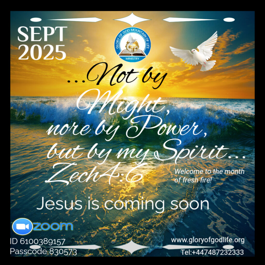 The Spirit of God is the author of natural and spiritual life. “Thou sendest forth thy spirit, they are created: and thou renewest the face of the earth” Ps104:30. New life, new testimony, new possibilities are born by the Spirit and the Spirit of God creates every day. Therefore, to rebuild a broken life or a damaged situation, to accomplish a set goal or a given desire, to win in the battle of life or to be delivered from your strong enemy, it is not by force or by strength, but by the Spirit of God. “There is no king saved by the multitude of an host: a mighty man is not delivered by much strength.” Ps33:16. Don’t count on your strength to give you victory, never put your trust in your physical power. “For I will not trust in my bow, neither shall my sword save me.” Ps44:6. The Spirit of the Lord is the only standard bearer that will deliver you in the days of great affliction. “So shall they fear the name of the LORD from the west, and his glory from the rising of the sun. When the enemy shall come in like a flood, the Spirit of the LORD shall lift up a standard against him.” Ps59:19. Human strength is deceptive and should not be the basis for our hope, our hope is in God and in the power of His Spirit. Your deliverance and your restoration will not be by bow and sword, but by the Spirit of the Lord your God. “But I will have mercy upon the house of Judah, and will save them by the LORD their God, and will not save them by bow, nor by sword, nor by battle, by horses, nor by horsemen” Hos1:7. This is the word of the LORD unto you this month, it is not by battle, nor by weapons but by the Spirit of mercy. Therefore, the Prophetic focus for the MONTH of SEPTEMBER 2025 is “NOT BY MIGHT, NOT BY POWER, BUT BY MY SPIRIT”. Zech4:6. Welcome to the manifestations of the Spirit of God in the name of Jesus.!. WARNING: “He heard the trumpet, and took not warning; his blood shall be upon him. But he that taketh warning shall deliver his soul.” Ezek33:5 SAVE YOUR SOUL NOW! Repent NOW. Receive JESUS and surrender your life to HIM! Rom 10:9-11John1:12 Rev3:20 ONLY THE SAVED CAN ENTER INTO THE KINGDOM OF GOD. ESUS IS COMING RIGHT AWAY